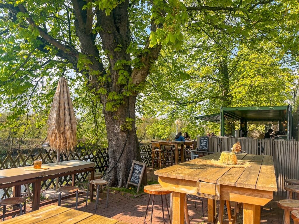 Der Trail führt wieder runter zum Ufer der Ruhr, dann weiter in den Stadtteil Saarn und in die dortigen Ruhrauen. Schilf wächst an den Ufern. Überall singen, rufen und piepen Vögel. Ambitioniert versuche ich, einzelne Arten zu identifizieren, gebe aber schnell auf und plane, den Zwitschomat oder eine andere Vogelstimmen-App zu installieren. Aber erst einmal freue ich mich an dem vielstimmigen Gesang und den zutraulichen Nutrias. In der Saarner Idylle verläuft der Ruhrtalradweg parallel zum Urban Trail und hier liegt auch ein originelles Restaurant, das die Tourenplaner in den Streckenverlauf aufgenommen haben.